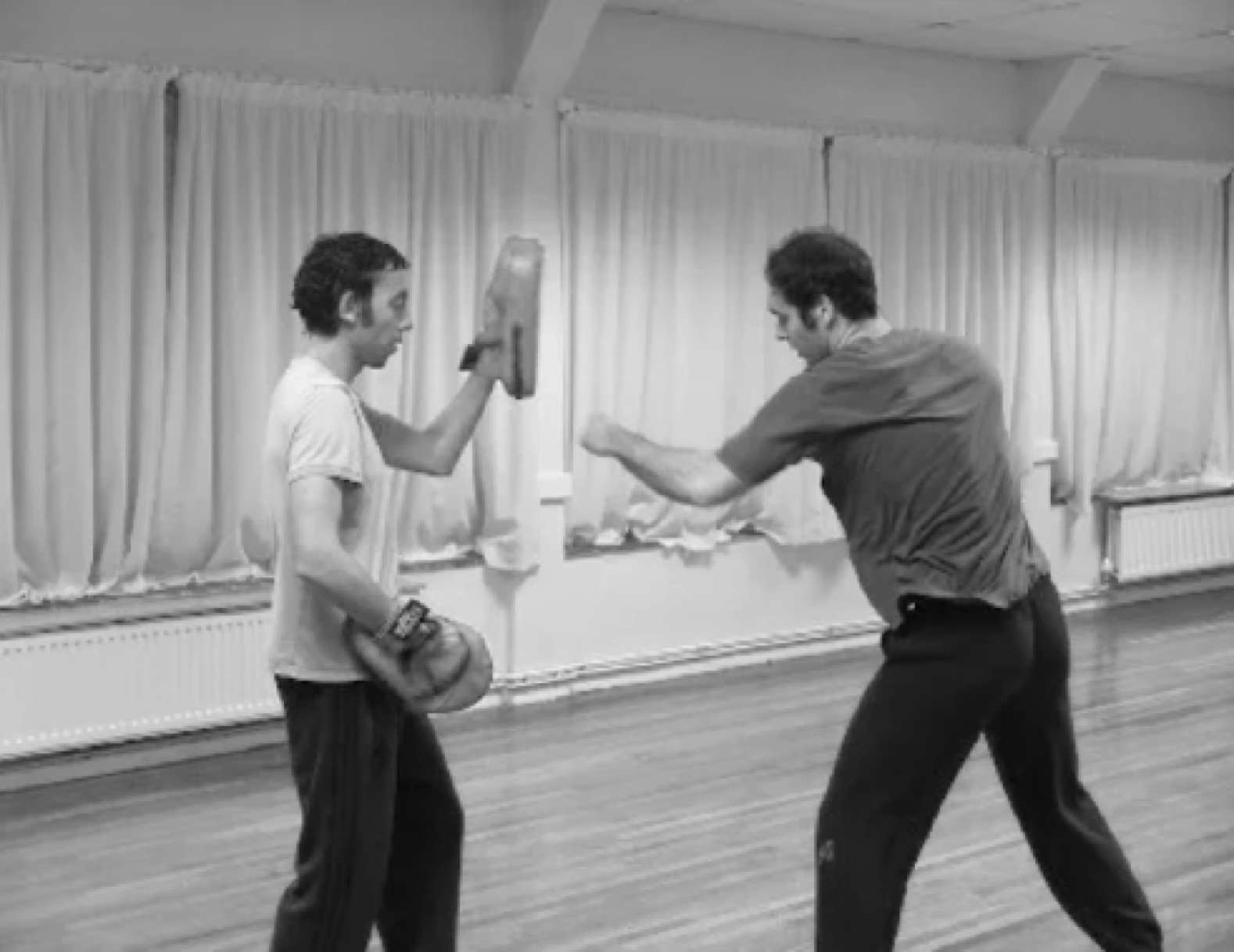 While gaining fitness, technique training focuses on simple strikes, grab releases, low kicks and some simple ‘dirty tricks’. So in a sentence, early training consists of: get fit, get strong, learn to hit and get mean.