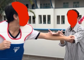 Shot 4. The defender has now moved a little and caught his attacker’s arm, while he has a good grip on the arm actually catching an arm mid punch is extremely difficult and he is yet to close the distance to his attacker, or strike his opponent in any way.