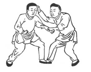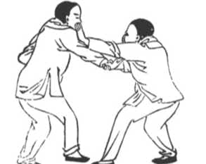 “I stick to him and go along..” this confirms the previous point, that you are NOT pushing the person away, you stay close and stick to the opponent, you don’t separate (come away) nor do you clumsily bump into them (crash in). The aim is to take momentary control of your opponent, not engage in an extended phase of pushing hands. Having taken control you are then in a position to strike your opponent from close range with them not being in a position to defend against the strike. This phase of the conflict is similar to the “HikiTe” (grabbing) technique seen in traditional Karate.